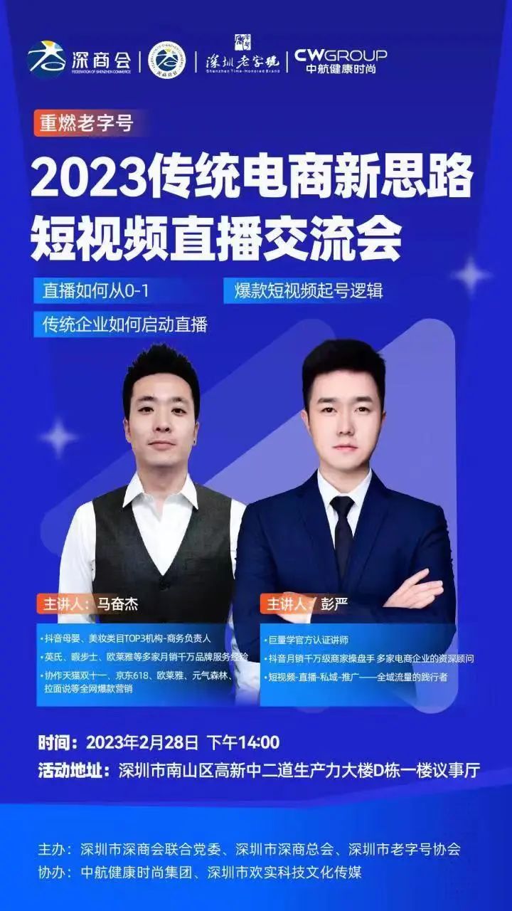 2月28日下午14:00,深圳市老字號協(xié)會邀請中航健康時尚集團短視頻直播運營團隊分享賦能經(jīng)驗,【重燃老字號】2023傳統(tǒng)電商新思路-短視頻直播交流會在深商服務中心舉辦。