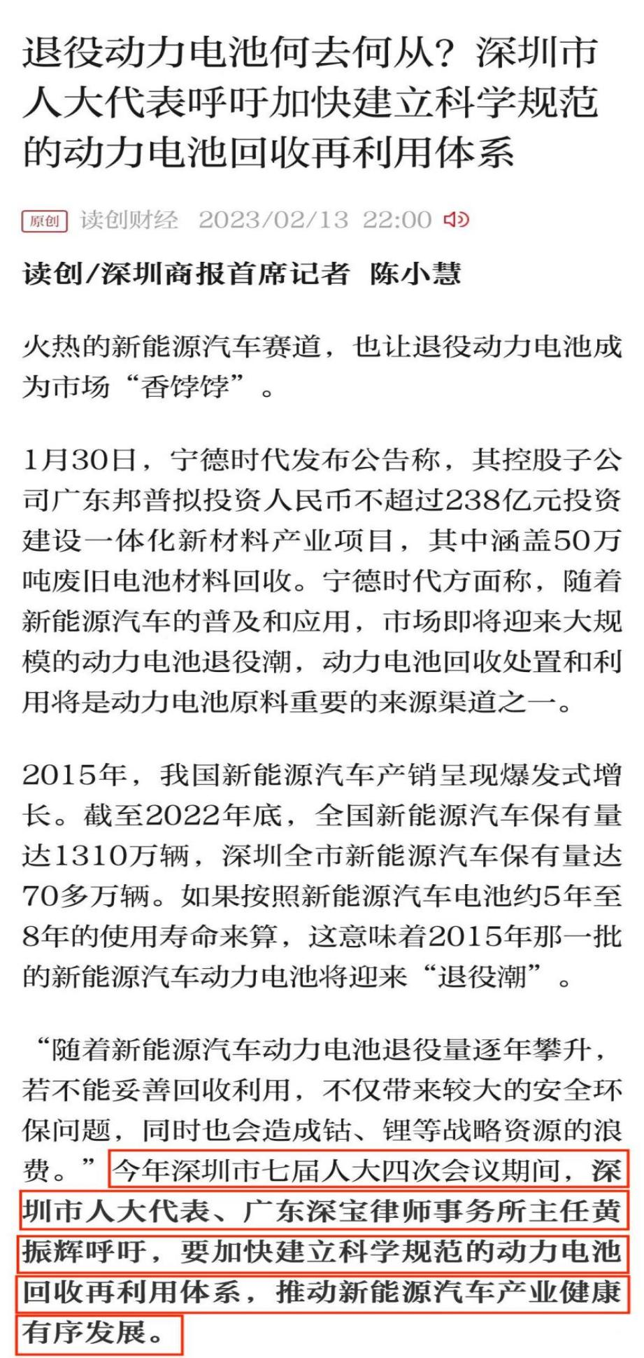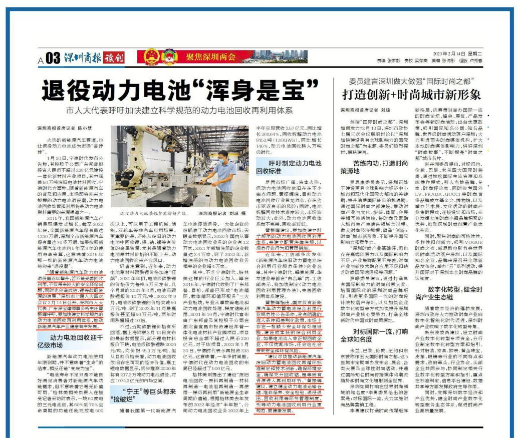 隨著新能源汽車動(dòng)力電池退役量逐年攀升,若不能妥善回收利用,不僅帶來較大的安全環(huán)保問題,同時(shí)也會(huì)造成鈷、鋰等戰(zhàn)略資源的浪費(fèi)。近年來,工信部多次表示將加快制定《動(dòng)力電池回收利用管理辦法》,完善回收利用體系建設(shè),強(qiáng)化新能源汽車動(dòng)力電池回收利用,完善制度建設(shè)和溯源管理。黃振輝代表呼吁,要加快建立科學(xué)規(guī)范的動(dòng)力電池回收再利用體系,推動(dòng)新能源汽車產(chǎn)業(yè)健康有序發(fā)展。
