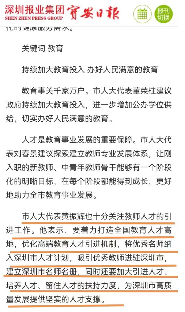 教育是改善民生福祉的關(guān)鍵,黃振輝代表認(rèn)為,目前深圳市仍存在學(xué)位不足、教育資源不均衡兩大問題,建議要著力打造全國教育人才高地,優(yōu)化高端教育人才引進(jìn)機(jī)制,將優(yōu)秀名師納入深圳市人才計(jì)劃,吸引優(yōu)秀教師進(jìn)駐深圳市,建立深圳市名師名冊(cè),同時(shí)還要加大引進(jìn)人才培養(yǎng)人才、留住人才的扶持力度,為深圳市高質(zhì)量發(fā)展提供堅(jiān)實(shí)的人才支撐。