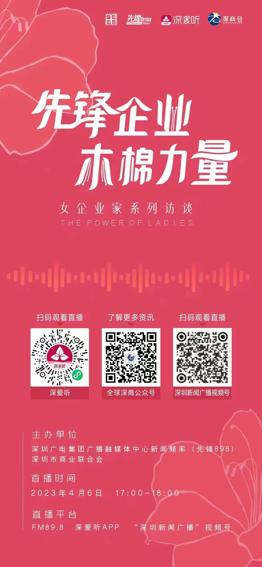據了解,“先鋒企業 木棉力量”節目將邀請科技類、餐飲類、服裝類、珠寶類等各行各業“先鋒女企業家”展現“她”力量。2023年4月6日起,每周四17:00-18:00,節目將在FM89.8或深愛聽APP播出,共十期。