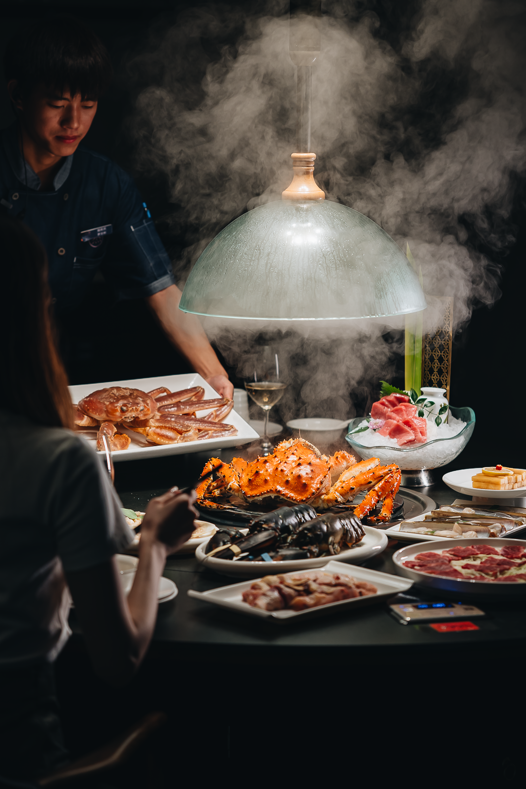 蒸汽海鮮升級品牌“青蓬臻海”,坐落于萬象前海商圈。作為品牌全新升級門店,除了圍繞“蒸汽”、“海鮮”外,還結合了高端商務品牌需要有的品牌調性進行創作,把“高端、年輕、商務、料理”的關鍵點貫穿在整個品牌塑造過程中,讓品牌與高端商務客群調性相接軌。