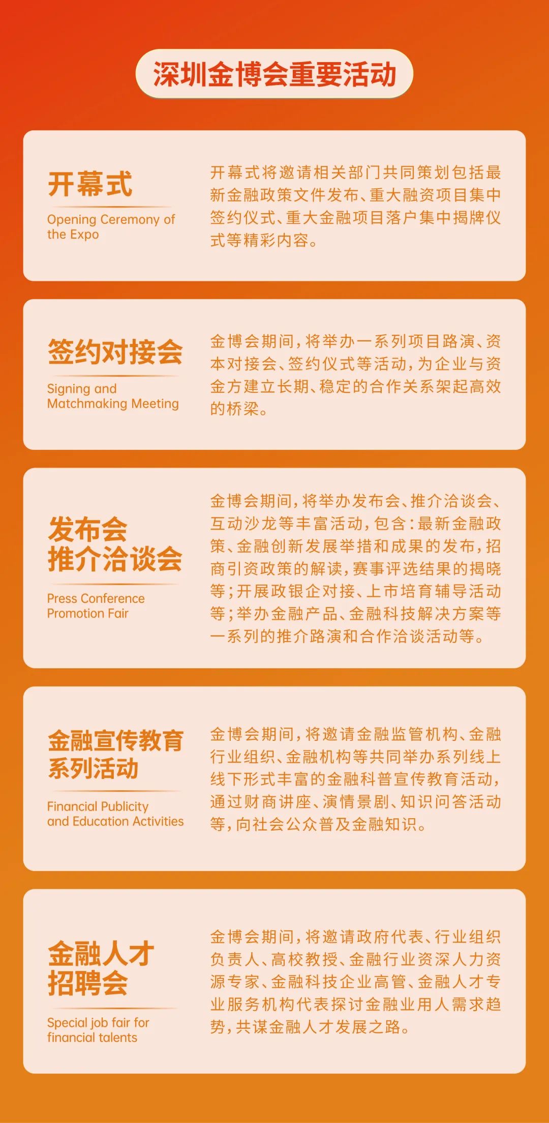 除專題展覽、研討活動外,本屆深圳金博會還將舉辦簽約對接會、發布會、推介洽談會、金融宣傳教育系列活動、金融人才招聘會等一系列主題活動。