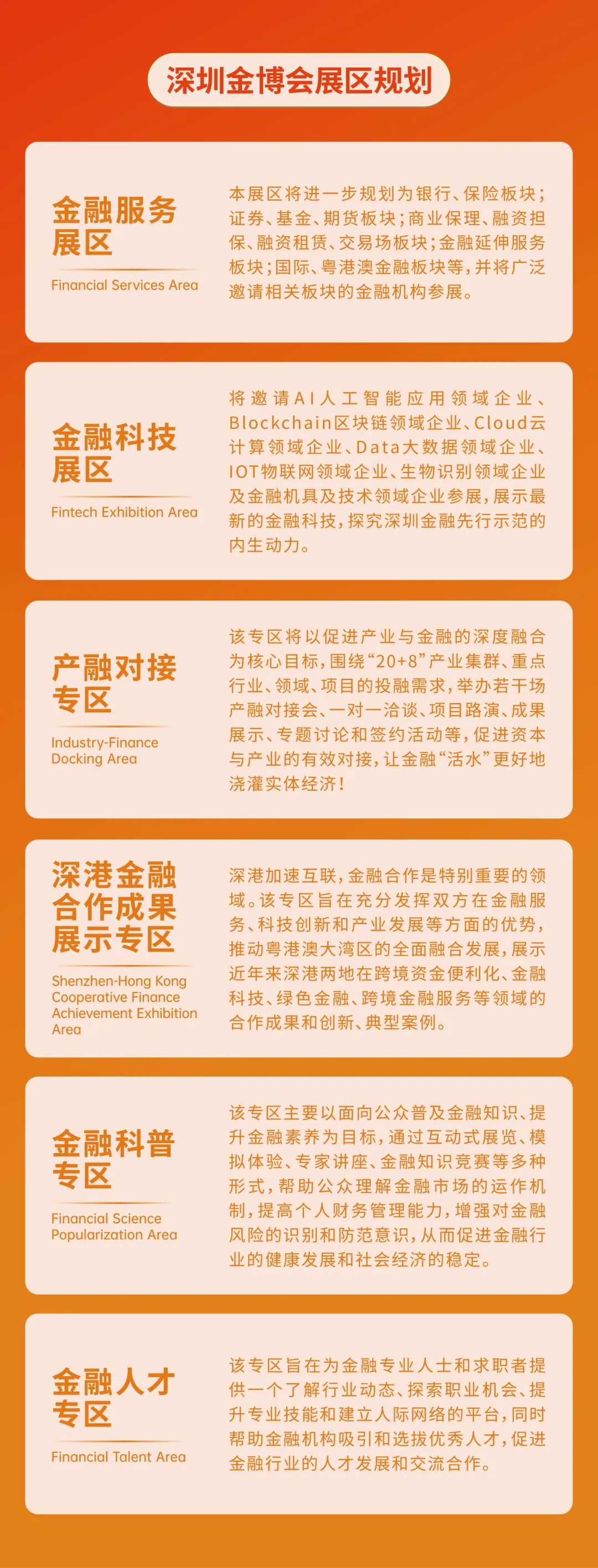 本屆深圳金博會將與“金融科技節”同期舉辦、深度聯動。其中,“深圳金博會”以展為主,在主會場聚焦金融行業的創新與發展,展示最新金融產品和服務,同時舉辦系列研討會和以金融為主題的對接、交易、推介活動。