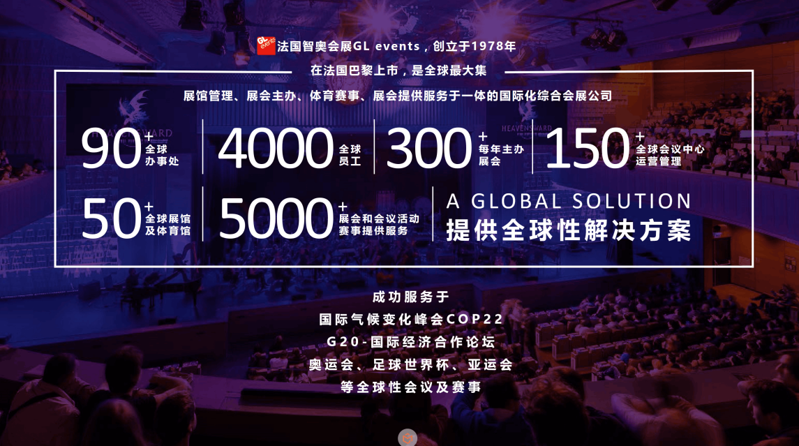 法國智奧會展集團(GL events Group以下簡稱“智奧會展”)創立于1978年,總部位于法國里昂,在全球范圍內設有90多家分支機構,是巴黎證券交易所的上市企業 (ISIN: FR0000066672 - TICKER: GLO)。